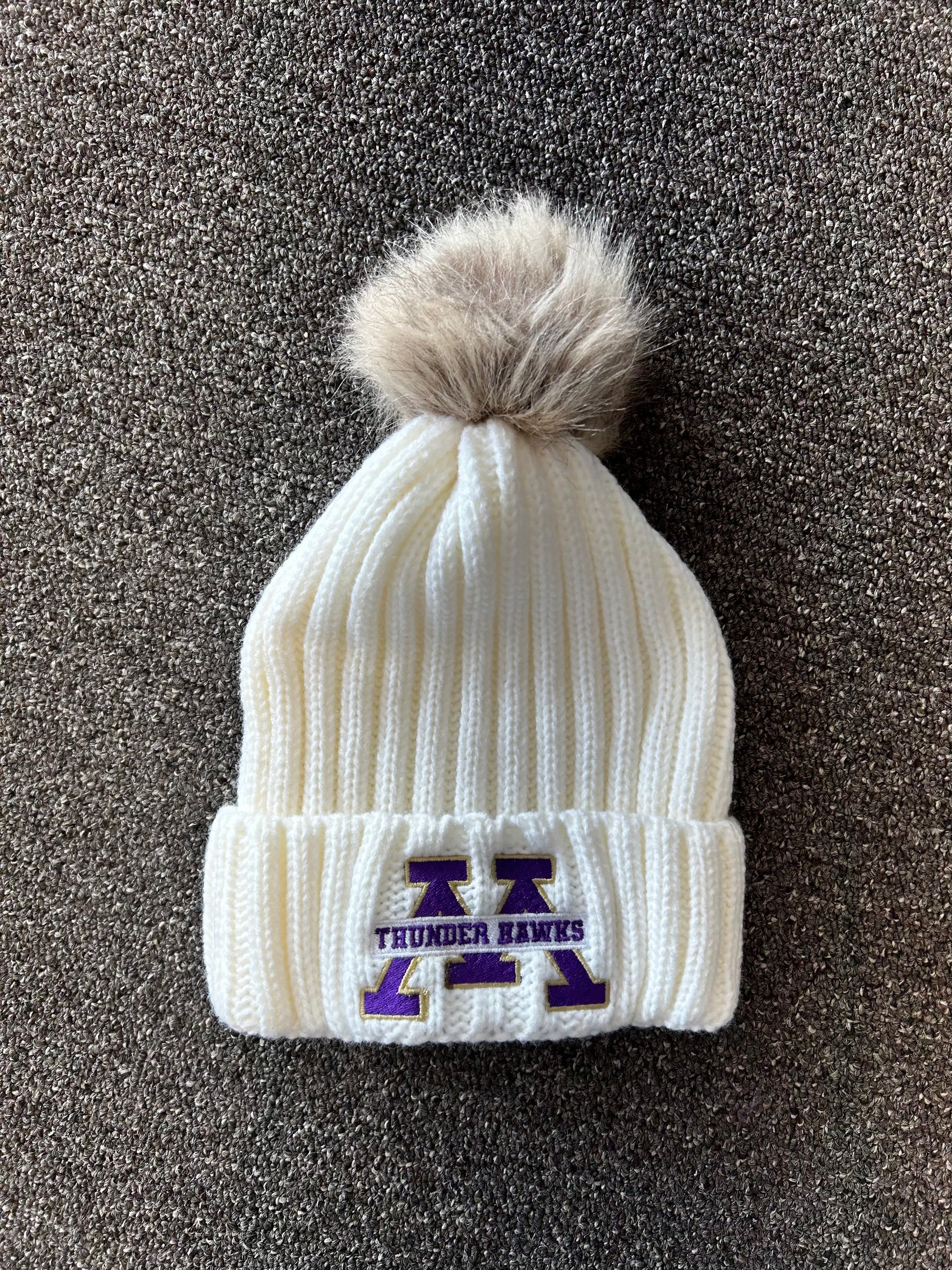 Totally on-trend, this women's beanie has a thick ribbed cuff and a cable knit crown that’s topped off by a fun faux fur pom.